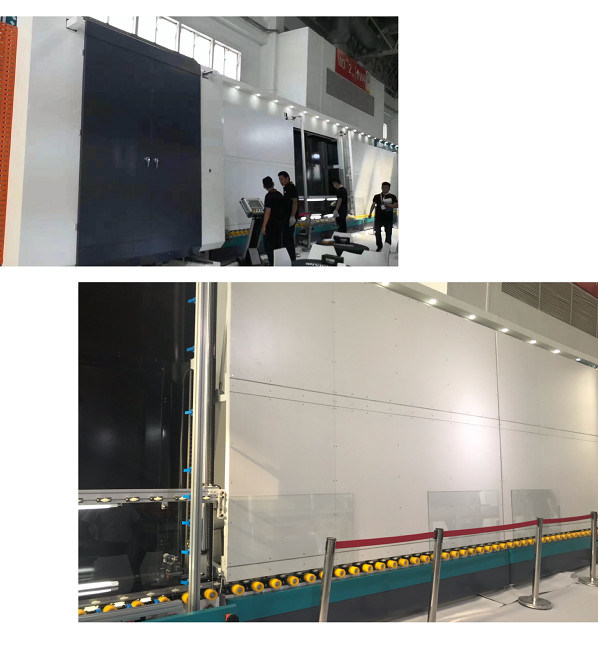 In de productie van tri-glas, nadat de eerste twee stukken worden gedrukt, zal de voor dringende plaat van het zuignapglas worden geopend, en het derde stuk van glas zal in de assemblagesectie van het aluminiumkader worden geplaatst. Nadat het glas wordt gebeëindigd, zal het de vlakke dringende sectie van de samengestelde plaat voor het vlakke drukken ingaan, en dan automatisch zal het naar de het draaien lijst worden overgebracht.