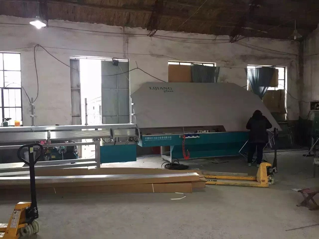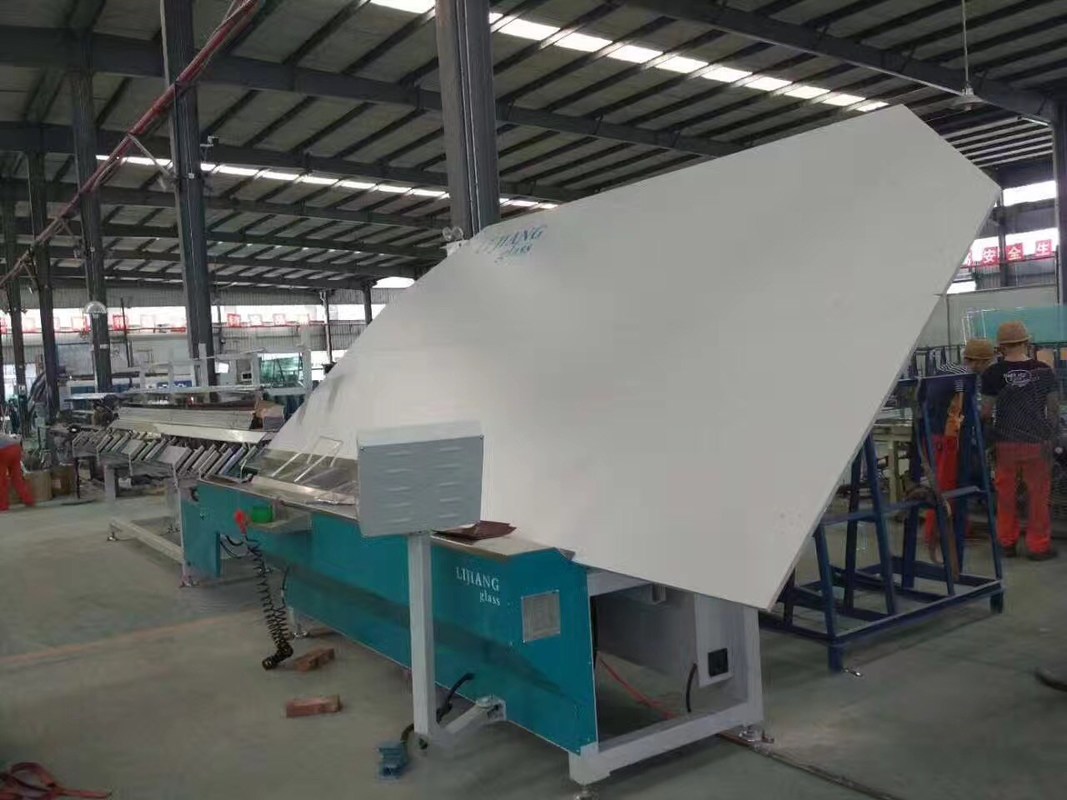 de schoonmakende en drogende sectie helde verticale plaatsing over. Het controlevakje wordt geschikt op buiten de schoonmakende sectie voor gemakkelijke verrichting. De schoonmakende sectie en watertank wordt gemaakt van roestvrij staal en corrosiebestendige materialen. De overdrachtrol is zuur-alkali rubberrol. De schoonmakende en drogende sectie keurt stepless de snelheidsregelgeving goed van de frequentieomzetting, en het glas kan regelmatig bij de aangewezen snelheid lopen. In de schoonmakende sectie, worden drie paren borstels schoongemaakt met de spuitbus van het hoge drukwater, die glas kan schoonmaken laag-e. Er is een paar geneigde luchtmessen met schot in het midden van de drogende sectie, die automatisch volgens de afstand tussen twee luchtmessen met verschillende dikte van glas kan worden aangepast, waarbij het effect van het aan de lucht drogen wordt verzekerd. De ventilator is 11KW.